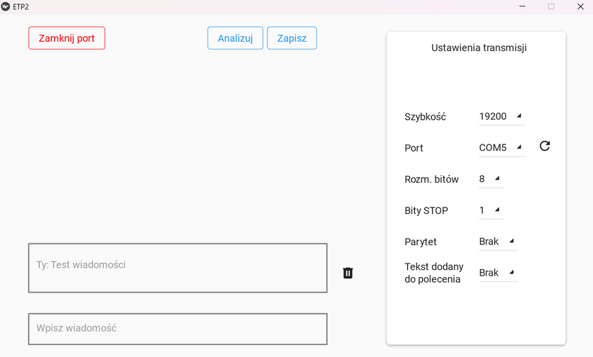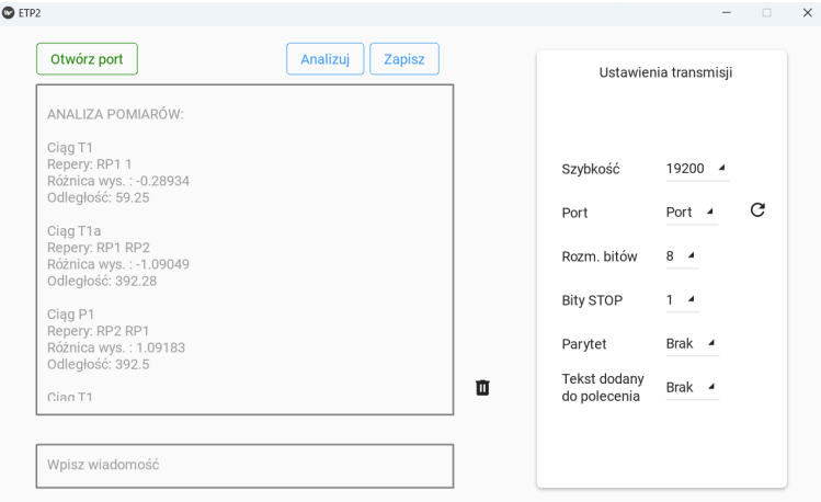 Utilizing an RS232 serial port or Bluetooth for communication between two devices with a module enabling the analysis of received geodetic measurements and transmission of commands to the measuring device.