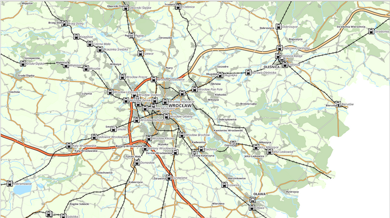 Railway and bus stations according to information from the BDOT10k Database.